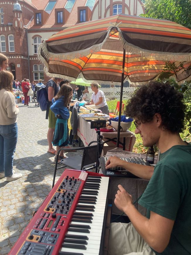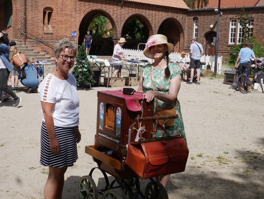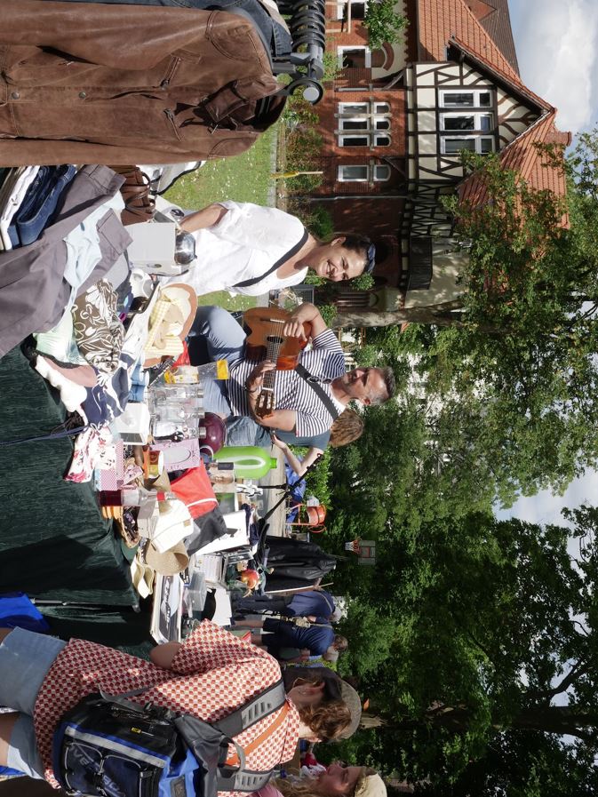 Bei perfektem Flohmarktwetter kamen unterschiedlichste Menschen zusammen, um von selbst geflochtenen Blumenkränzen über Schreibmaschinen und Bekleidung alles anzubieten, worüber sich andere (noch) freuen könnten. Auch Musikinstrumente … und auf denen wird kurzer Hand gemeinsam Musik gemacht. Die perfekte Überleitung zum Leierkasten-Auftritt von Ingrid Monzer, der einen zwischen den historischen Backsteingebäuden fast nostalgisch werden lässt.