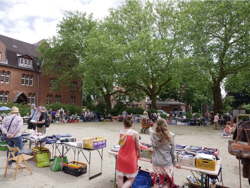 Am 2. Juli veranstalteten der Anscharcampus, die Ev.-Luth. Apostel-Kirchengemeinde Kiel/ Petruskirche, das Nachbarschaftshaus Haus 12 im Anscharpark und das Projekt Inklusives Quartier mit weiteren Aktiven, einen Flohmarkt rund um die Weimarer Straße. Gemeinsame Idee war es, die Nachbarschaft zusammenzubringen, aber auch Menschen von weiter her ins Quartier einzuladen, um neue Lieblingsteile zu erstehen, sich kennenzulernen und herauszufinden, was zusammen möglich ist. “Wir möchten den Park Schritt für Schritt mit gemeinschaftlichen Aktionen beleben”, sagt Konny vom Aktiv-Treff des Nachbarschaftshauses.