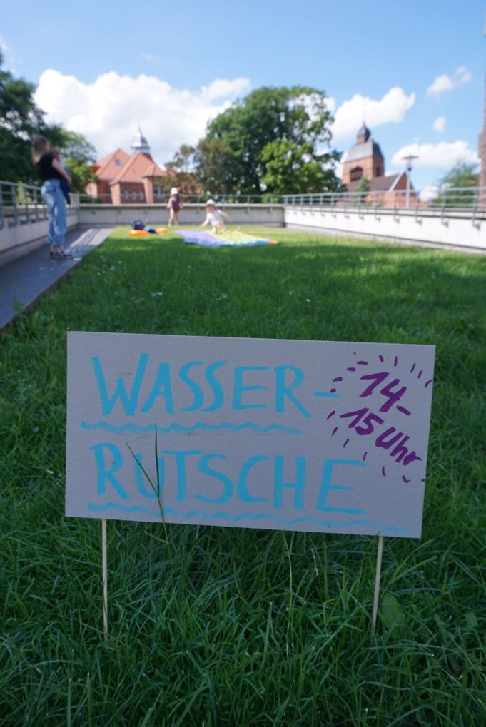 Neben den Ständen zeigt das Inklusive Quartier die Ergebnisse von Anschartopia, einem Workshop mit Kindern zum Thema: Was wünschst Du Dir für den Anscharpark? Einige der Ideen sind liebevoll in mehreren Stationen auf dem Parkgelände mit Hilfe von (Sound-)Installationen umgesetzt. Ein kleines Gehege, das zunächst leer scheint, offenbart aus der Nähe verschiedenste Tiergeräusche … ein “Lausch-Zoo”, der die Phantasie anregt! … Und die begrünte Tiefgarageneinfahrt wird zur Wasserrutsche.