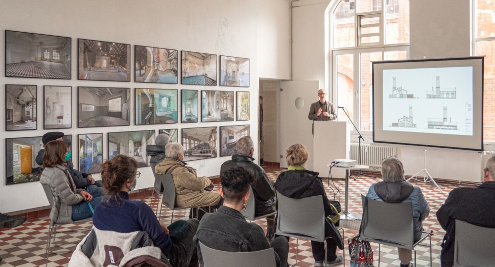 Das auf vielen Bildern sichtbare Abbruchsmoment spiegelte sich eindrücklich in dem aufgetürmten Bauschutt vor dem großen Galeriefenster zum eingezäunten Kesselhaus, wo der Abbruch zugleich einen Aufbruch markiert. Die Ausstellung setzt sich so im Draußen fort und tritt in Dialog mit der Gegenwart im Anscharpark, auch auf der gegenüberliegenden Seite mit dem Blick auf das “noch schlummernde” Haus 3, dem letzten verbliebenen Bettenpavillon, der Projektionsfläche für unterschiedlichste Wünsche und Visionen bietet.