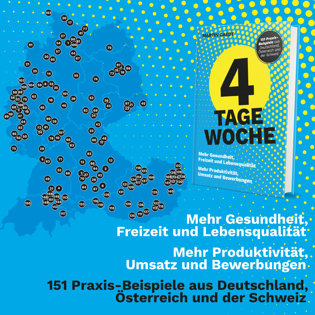 Keine Frage, die 4-Tage-Woche polarisiert. Was ist dran an dem Versprechen von mehr Lebensqualität und gleichzeitig mehr Produktivität? Wie lässt sich eine 4-Tage-Woche im Büro und im Betrieb gestalten? Welche Auswirkungen hat dieses Arbeitszeitmodell auf Wirtschaft und Gesellschaft? Diese Fragen wollen wir mit Autor Martin Gaedt gemeinsam diskutieren – und natürlich mit Unternehmerinnen und Unternehmern, die die 4-Tage-Woche umgesetzt haben.