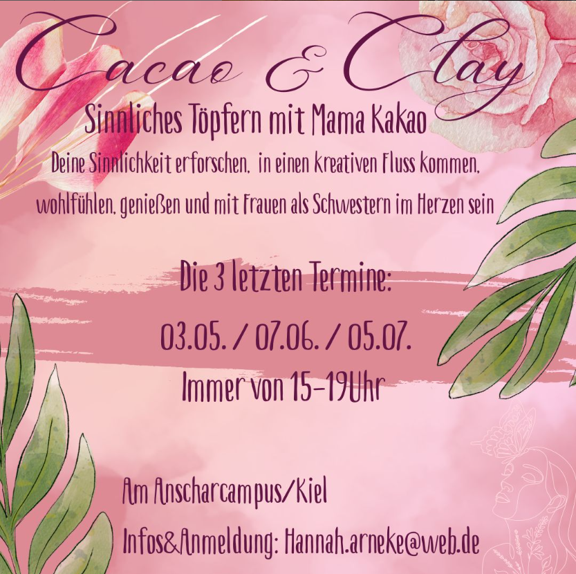 In Cacao & Clay bietet Hannah Arneke einen geschützten Raum, um sich gegenseitig zu inspirieren und einen sinnlichen Zugang zur eigenen Kreaitivität zu entdecken. Nach einer Kakao-Zeremonie wird es Raum geben, um eigene Kunstwerke aus Ton zu gestalten und sich mit anderen Frauen auszutauschen.