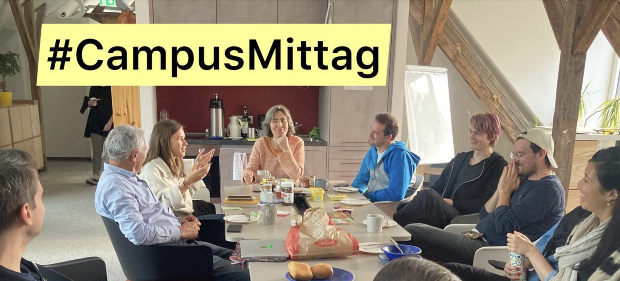 Gemeinschaft geht durch den Magen. Deshalb ist unser gemeinsames Campus-Mittag jeden Montag um 13:00h im Coworkhaus als Dreh- und Angelpunkt für Austausch und Inspiration in der Community. Wir stellen die Brötchen, ihr den Belag oder bringt Euer Lieblingsessen von zuhause mit. Dieses Jahr wird's auch ein paar Ausflüge ins Atelierhaus geben :-D