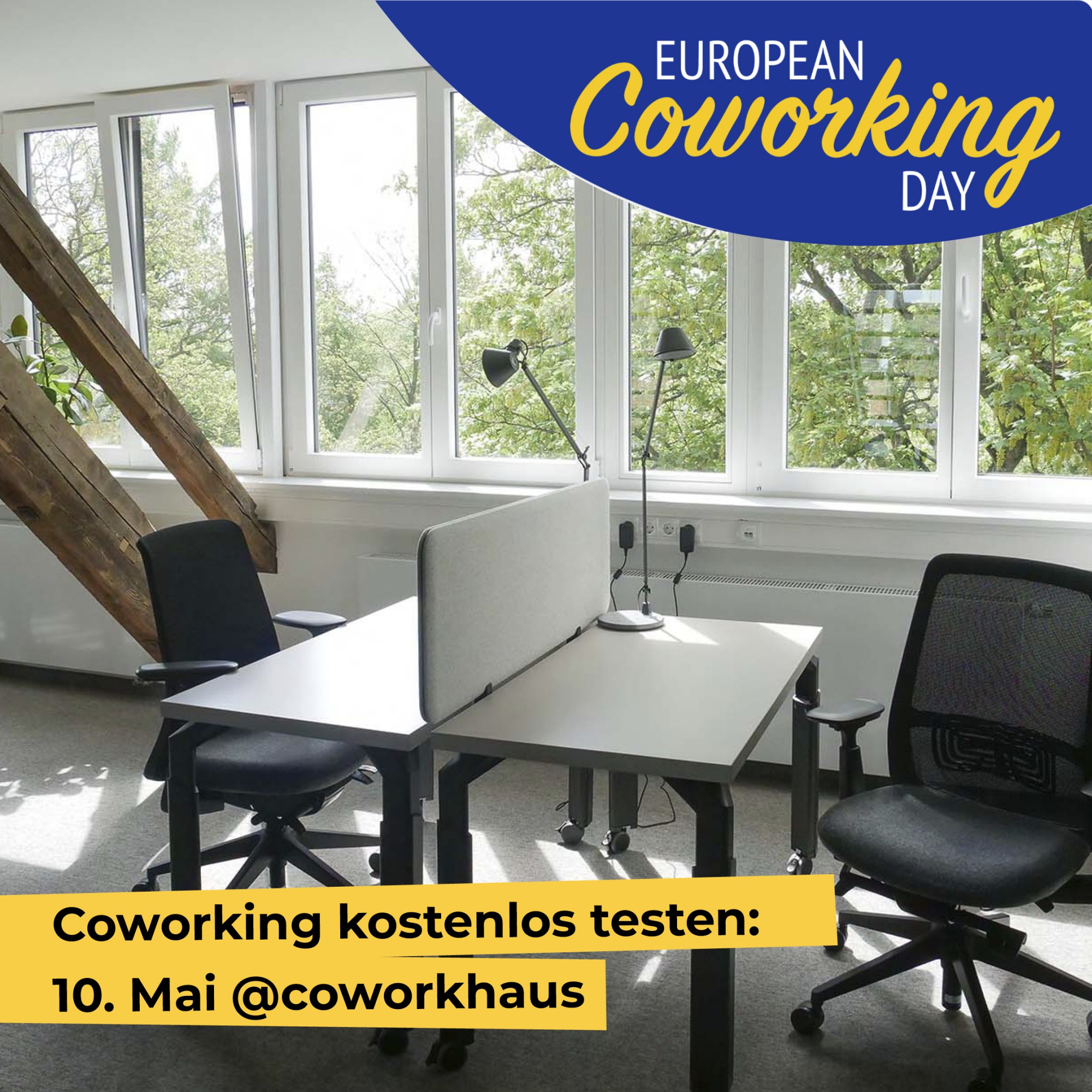 Zum European Coworking Day laden wir euch ein, Coworking einmal auszuprobieren und das Coworkhaus von innen kennenlernen. Kommt einfach am 10.05. vorbei und meldet euch zwischen 9:30h und 14:00 am Empfang (Weimarer Str. 6), arbeiten könnt ihr dann auch länger.