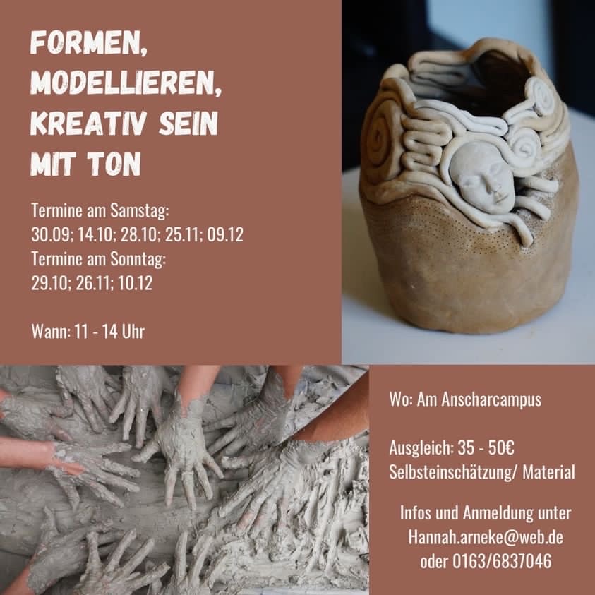 Ich gebe dir verschiedene Arbeitsweisen mit an die Hand. Was daraus entsteht werden wir sehen. Du kannst an einem Kurstag einem Projekt nachgehen oder dich ganz frei meditativ dem Ton hingeben. Wir untermalen den Prozess musikalisch und schaffen eine angenehme Atmosphäre.