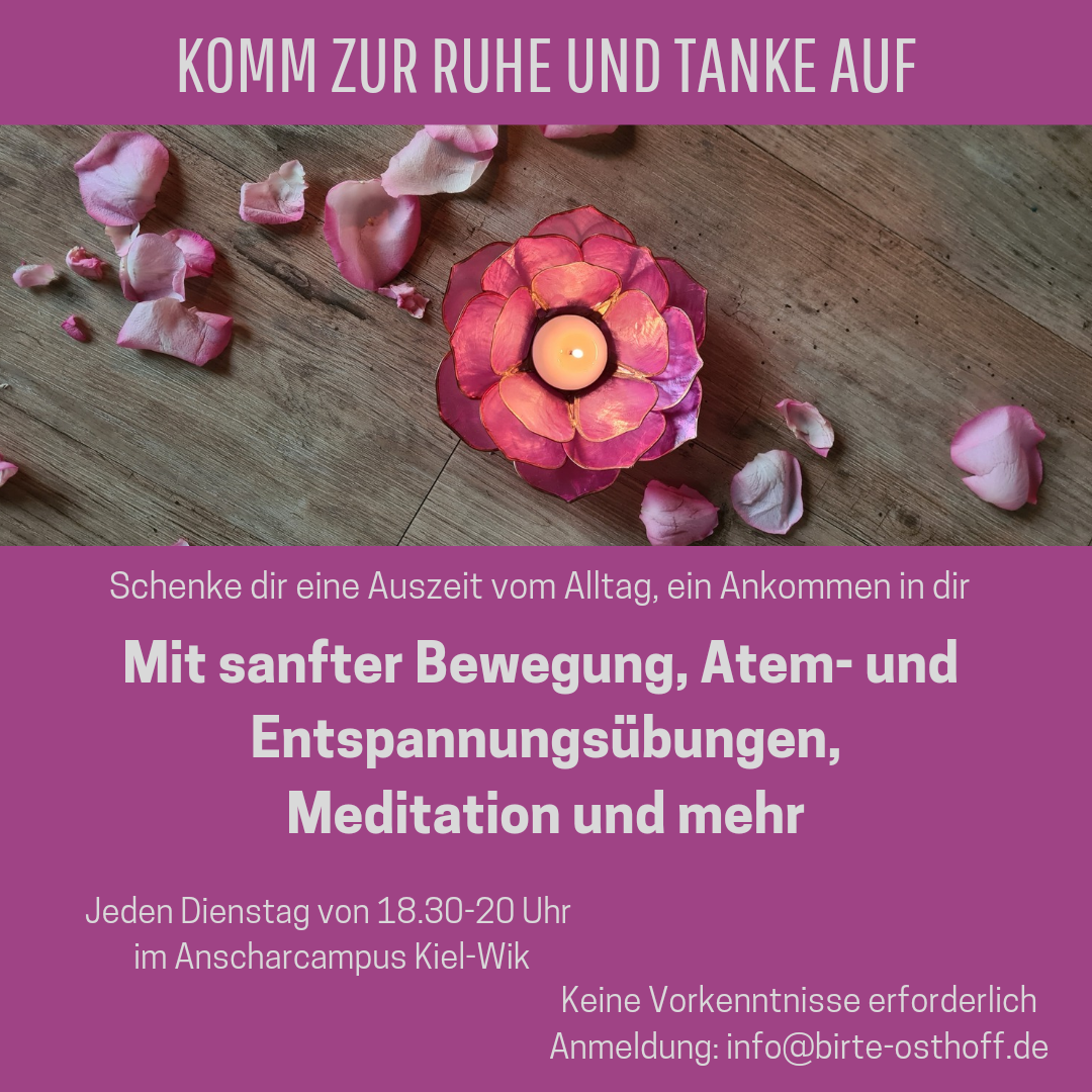 Birte Osthoff lädt dafür im Herbst in den Anscharcampus in eine offene Gruppe ein – egal ob Anfänger:in oder mit Erfahrung: alle sind willkommen. Es erwarten die Teilnehmenden Atem- und Entspannungsübungen, verschiedene geführte Meditationen, sanftes Yoga und Tipps für die Integration von Entspannung in den Alltag.