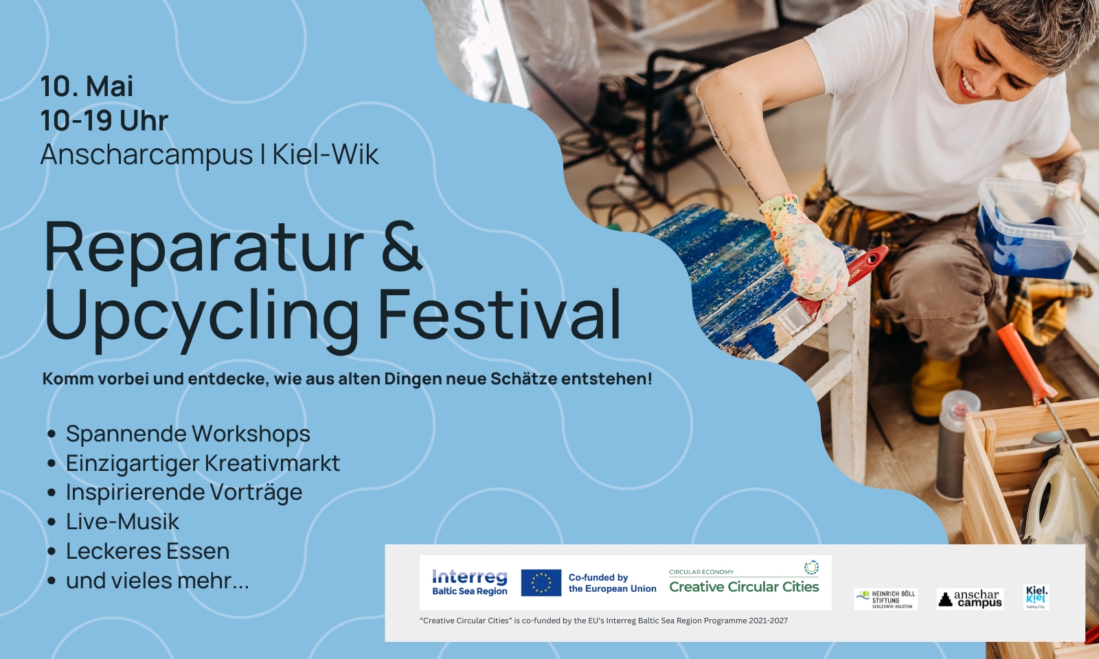 Das Festival wird im Rahmen des Projekts Creative Circular Cities in Kooperation von der Heinrich-Böll-Stiftung dem Anscharcampus und dem Zero Waste Kiel e.V. durchgeführt und ist gefördert durch Interreg Baltic Sea Region, kofinanziert durch die Europäische Union.