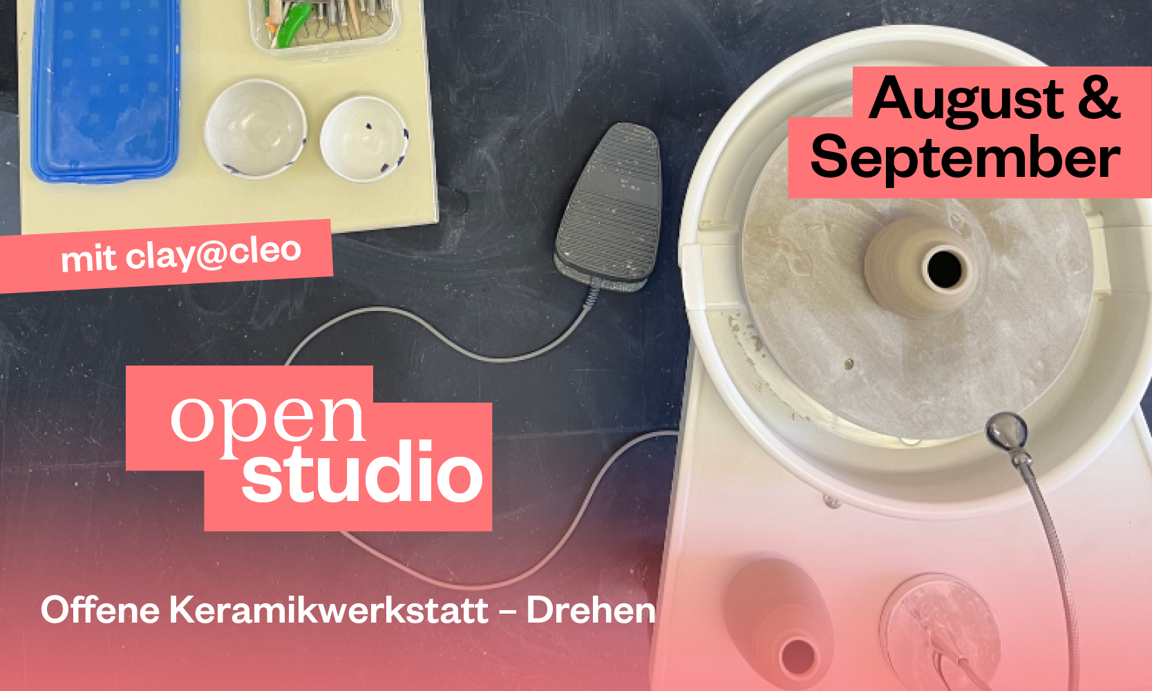 Im August und September bietet unsere Künstlerin Keun Woo Lee alias clay@cleo eine offene Keramikwerkstatt an im Coworkhaus auf dem Campus. In der offenen Keramikwerkstatt stehen für Fortgeschrittene zwei Drehscheiben zur Verfügung, die nach einer kurzen Einführung individuell genutzt werden können.