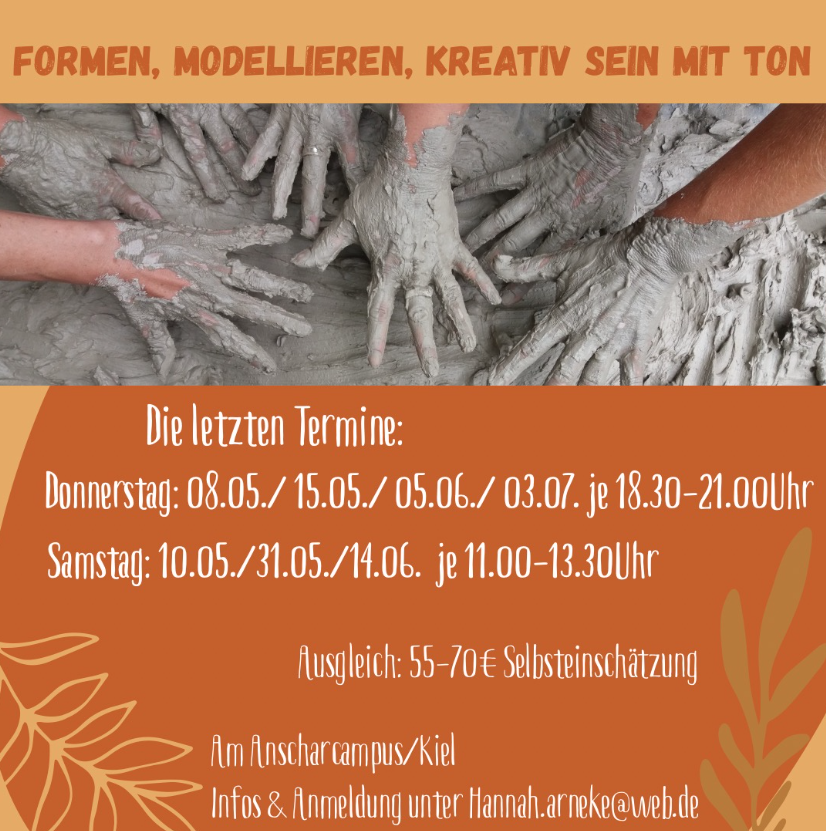 In entspannter Atmosphäre zeigt die Künstlerin Hannah Arneke verschiedene Techniken, mit denen man Ton ganz nach den eigenen Vorstellungen gestalten kann. Ob Schale, Becher, Vase oder freie Form - dem kreativen Ausprobieren sind keine Grenzen gesetzt.